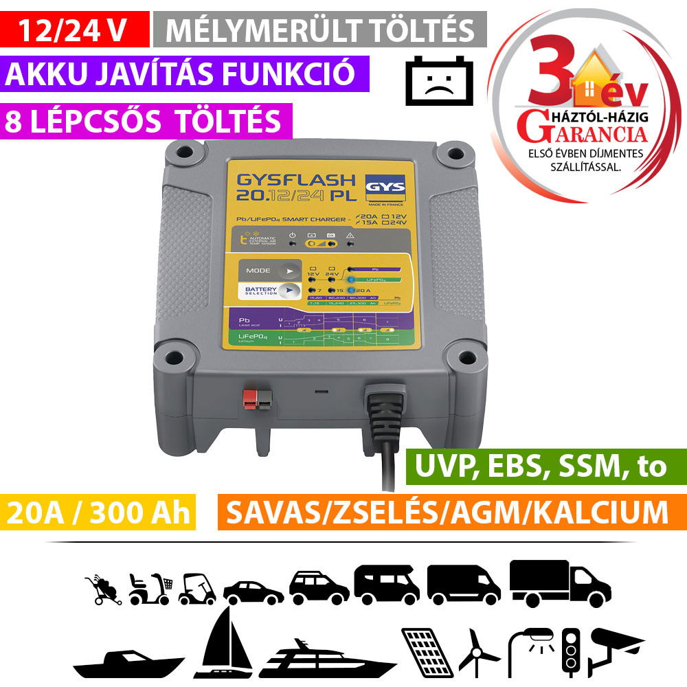 A 20 A teljesítményű GYSFLASH 20.12/24 PL egy többfeszültségű töltő, amely 12 V-os és 24 V-os ólomsavas akkumulátorok (gél, AGM, folyékony, stb.) és lítium-vas-foszfát akkumulátorok (LFP / LiFePO4) töltésére szolgál.