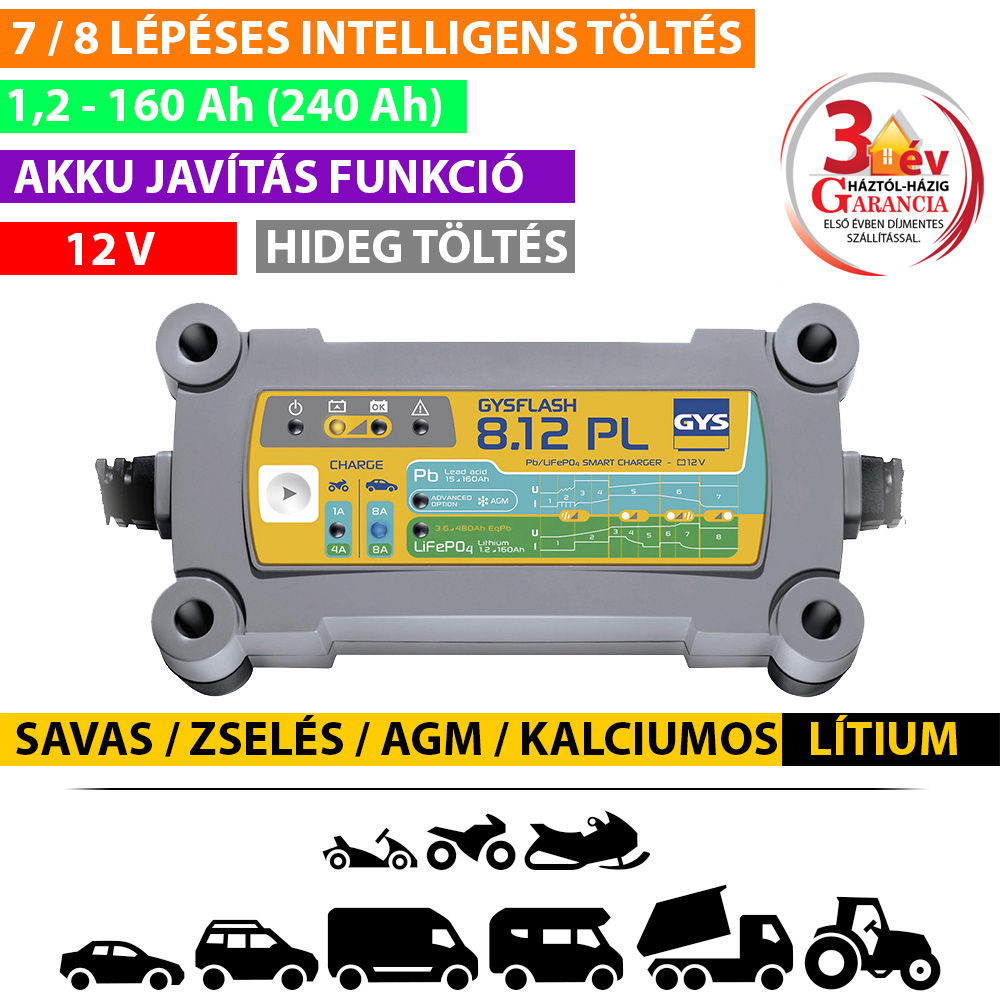 A GYSFLASH 8.12 PL (8 A) egy fejlett töltő, amelyet 12 V-os ólom-savas és lítium-vas-foszfát (LiFePO4) akkumulátorok töltésére terveztek. 2 különálló és intelligens töltőprogrammal rendelkezik, amelyek optimalizálják az egyes akkumulátortípusok teljesítményét. A 8 A-es töltőáram ideális autók, kisteherautók és lakóautók akkumulátorainak töltésére.