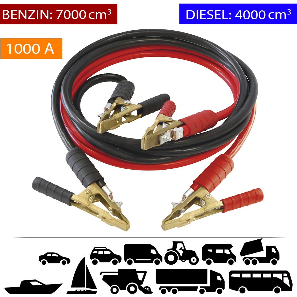 A szigeteletlen sárgaréz csipeszekkel ellátott indítókábelek a könnyen hozzáférhető akkumulátorokkal rendelkező járművekhez ideálisak.