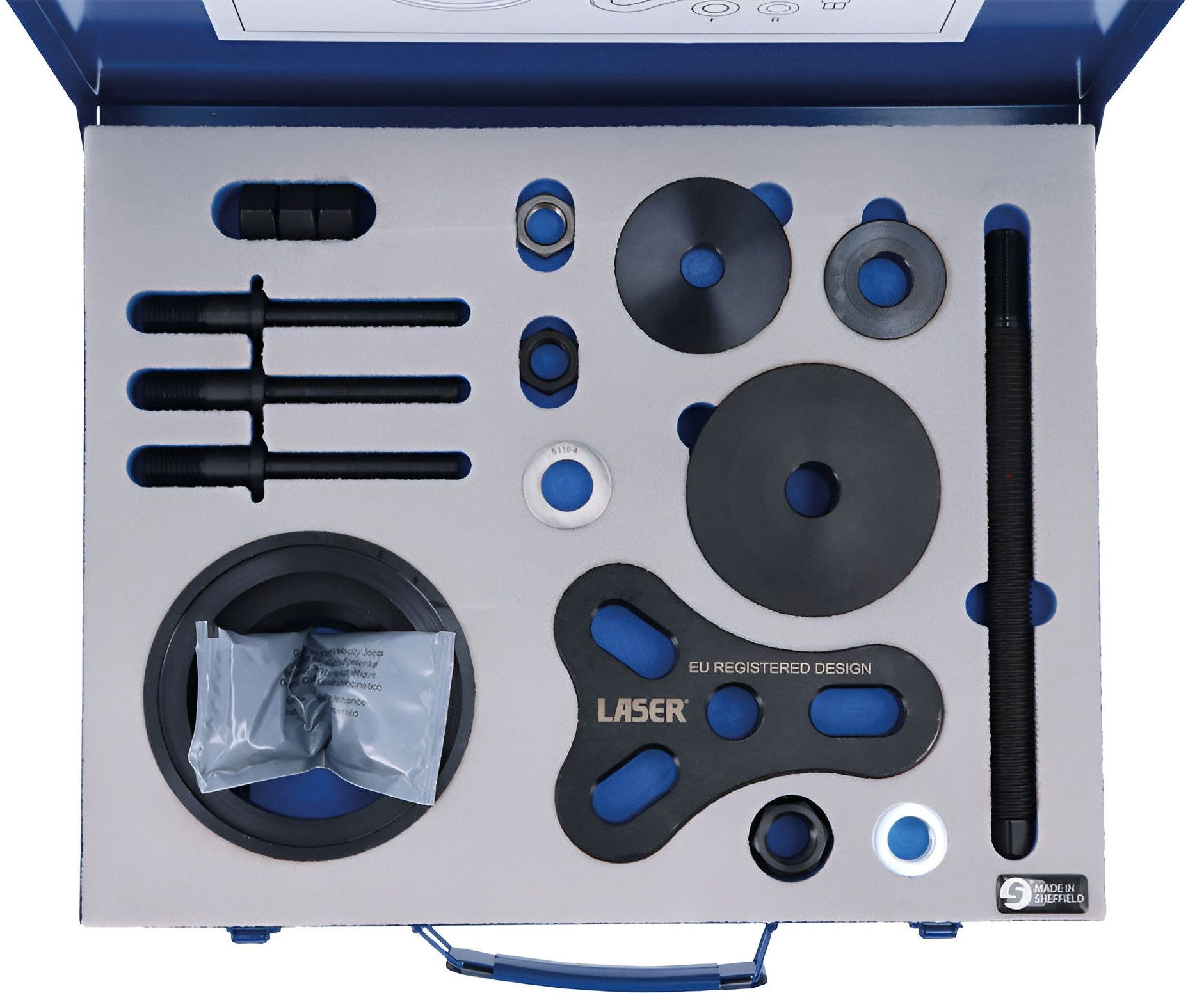 Ez a célszerszámkészlet Angliában Sheffieldben készült készlet EVA habtálcában és fémdobozban érkezik.